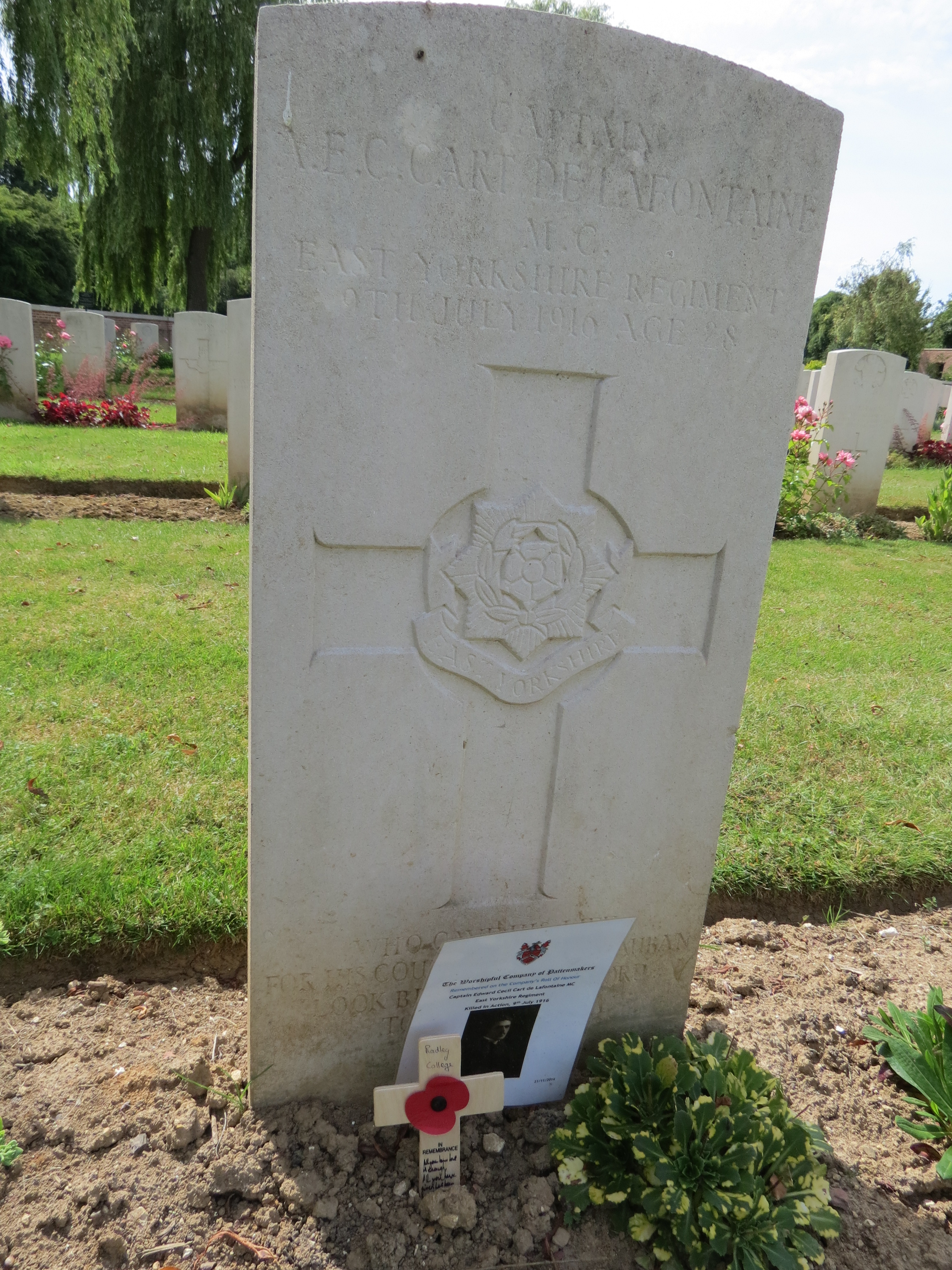 8th July 1916. Alfred Cart de Lafontaine, MC. C Social 1903. Captain, East Yorkshire Regt., 76th Infantry Brigade (attached Headquarters Staff). Killed in action at Montaubon, Battle of the Somme.