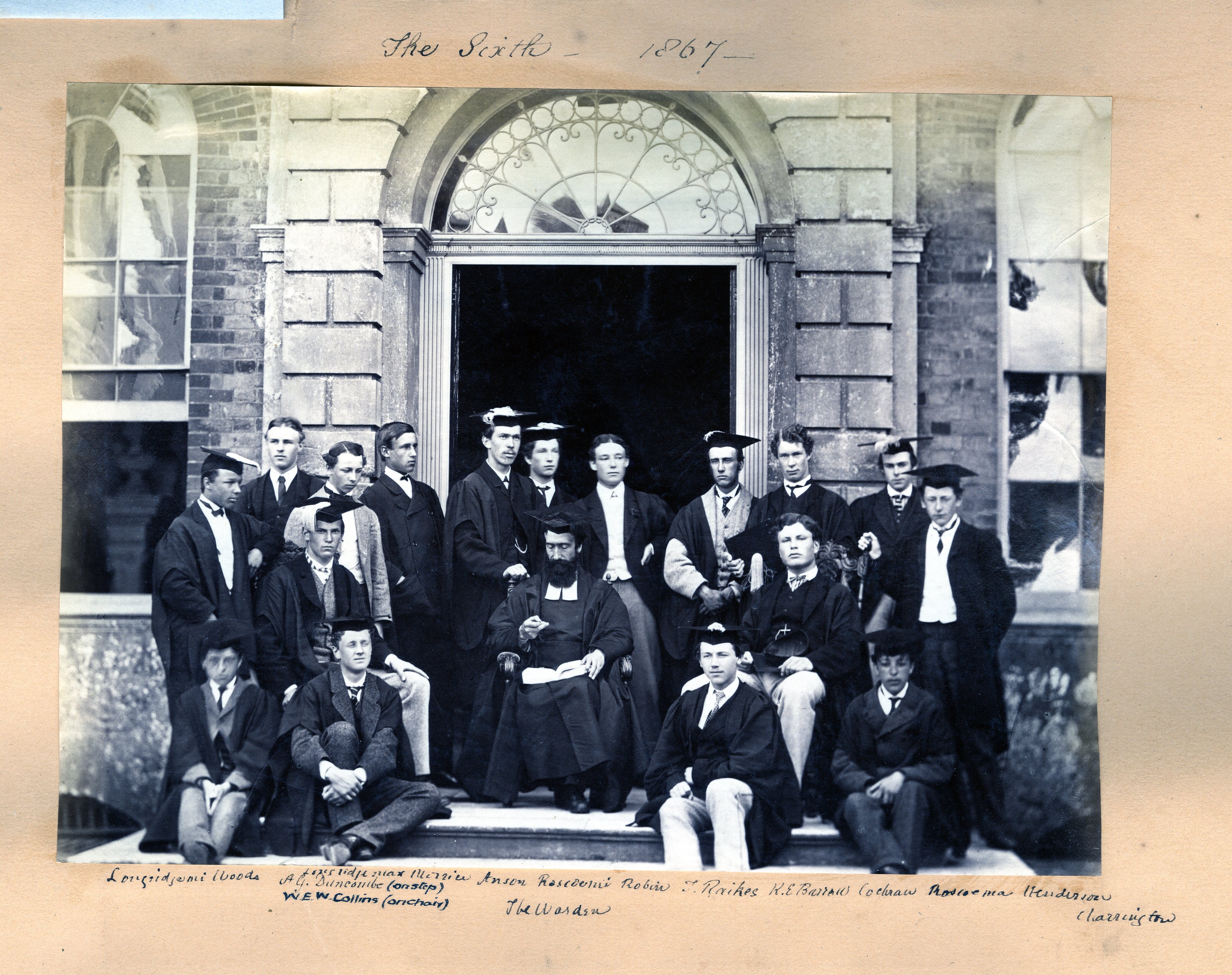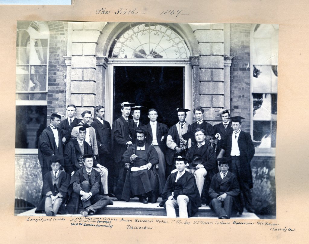 Warden William Wood with the Sixth Form in 1867. The prefects can be identified by the silver tassels, while the more junior boys have black tassels on their mortar-boards. But not all of them have them with them for the photo.