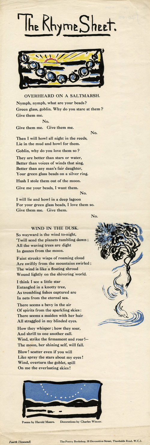 Harold Monro’s contribution to twentieth century poetry cannot be under-estimated. In 1912 he founded the Poetry Bookshop. The Bookshop was more than just a shop it was a kind of mission station, dedicated to the making, reading and propagation of poetry, not just for poetry’s sake, but as part of Monro’s socialist, humanitarian Utopia. The aim was to provide a haven in London where poets could meet, where they could live for very little rent, and from which their poems could be published and sold. The Poetry Bookshop endured for twenty years as the leading home of the innovative poetry of the early twentieth century: poets, artists and writers associated with it included Wilfred Owen, Ezra Pound, Anna Wickham, Charlotte Mew, Osbert Sitwell, Alec Waugh, E. McKnight Kauffer (who painted the shop sign), and Eric Ravilious. It was in the heart of Bloomsbury, and certainly influenced the Bloomsbury Group in the 1920s and 1930s.
