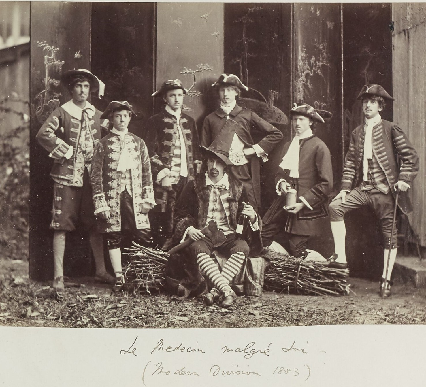 However accomplished the Radleian linguists of the time, seventeenth-century language does pose some challenges, even for a French audience. Molière’s verse plays, written in classical alexandrines (twelve-syllable rhyming couplets), have understandably not been chosen by any of the casts. The boys went for the prose plays instead. Not only is the language more straightforward, but in the prose plays, the comic spirit stems from the Italian comedia dell’arte tradition, full of slapstick and brisk situational comedy that is more readily enjoyed by a foreign audience. Notable Radleian performances of selected scenes from Molière include Le Médecin malgré lui (1869, 1883, 1949), Les Fourberies de Scapin (1885, 1889), Le Malade imaginaire (1946, 1966), Le Bourgeois gentilhomme (1881, 1884), L’Avare (1882, 1886, 1892).