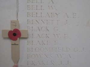 George Bloomfield’s name on the Ploegsteert Memorial. Photographed for ‘Marching in Memory’ July 2015