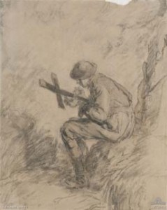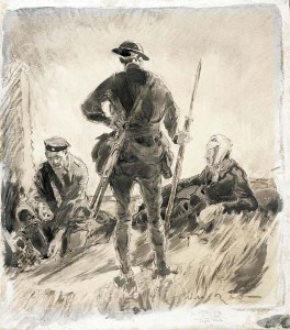 Old Bill is a fictional character created in 1914-15 by cartoonist Bruce Bairnsfather. Old Bill was depicted as an elderly, pipe-smoking British “tommy” with a walrus moustache. The character achieved a great deal of popularity during World War I where it was considered a major morale booster for the British troops. Old Bill and his younger troopmate little Alphie were private infantrymen in the British Expeditionary Force.