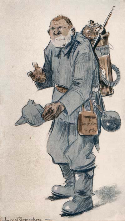 Louis Raemaekers was born in the Netherlands in 1869. He led a quiet life, painting landscapes while studying and teaching in Amsterdam and Brussels. In 1906 he was asked by a newspaper in Amsterdam, Het Handelsblad, to produce a series of cartoons. His initial attempt at a comic strip was a complete failure, so he turned to politics.