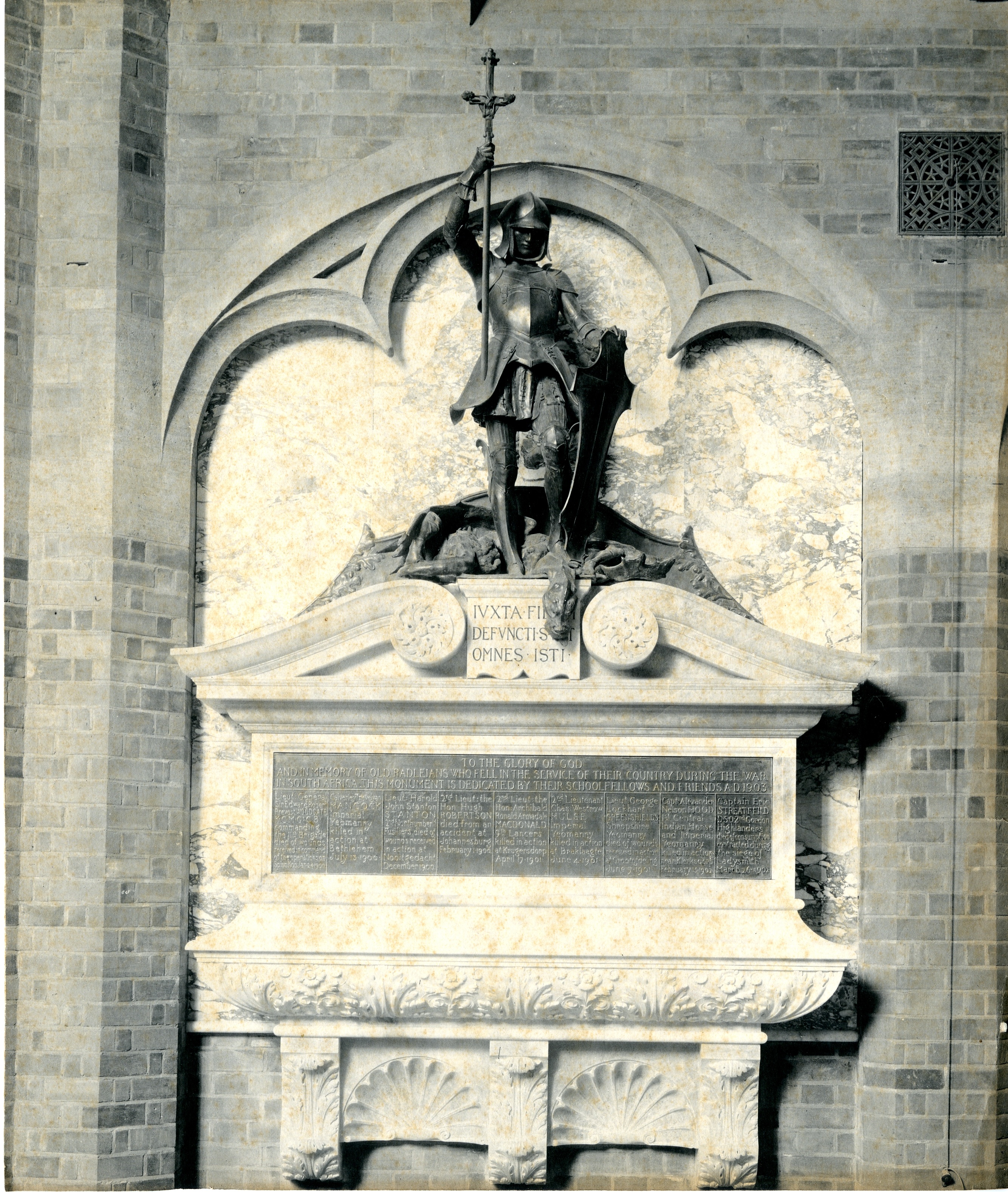 | Second South African War, 1899-1902 (The Boer War) There are a number of brass plaques to individual Radleians killed in action before 1900, but the earliest group War Memorial is that for the Second South African War, 1900-1902, located in the Chapel. It bears the names of nine Radleians. The memorial was designed by Sir Thomas Jackson, the architect who designed the Chapel in 1895, H Social in 1909, Hall in 1910, and the War Memorial Arch in 1919. The bronze figure of St George slaying the dragon is by George Frampton, RA. The pedestal is alabaster. The memorial was paid for by subscription. It was over-subscribed and the balance of the fund was used to found the Old Radleian French Prize. |