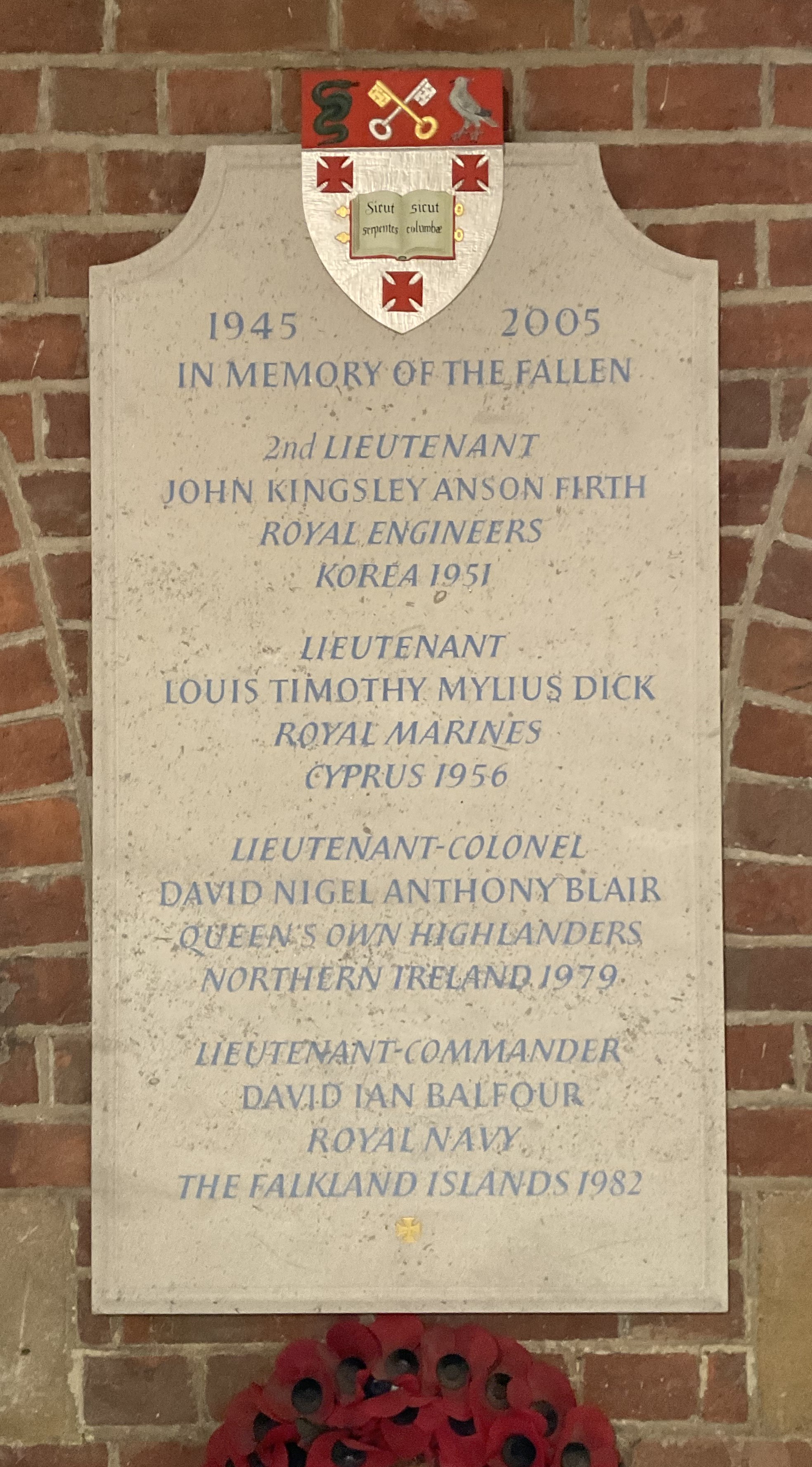 A Memorial to those killed on active service between 1945-2005 was dedicated by the Radleian Society in 2008. It contains four names. It is by the Kindersley Workshop and is located in the Cloisters, opposite the World War 2 commemorative wall. Their names are listed here